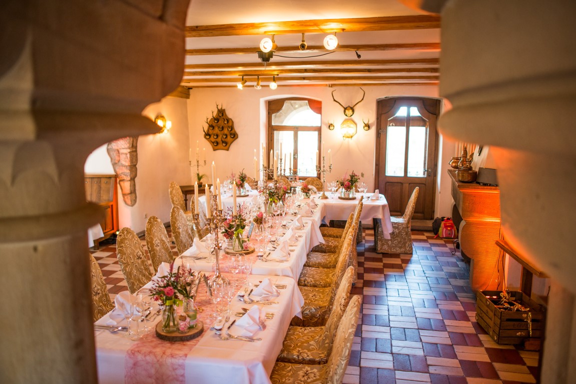 Im historischen Kaminsaal, wo einst Carl Graf v. Berlepsch residierte, erwartet uns ein festliches Abendmenü. Die wuchtigen Sandsteinelemente und die gemütliche Einrichtung schaffen den perfekten Rahmen für unseren gemeinsamen Abend in gemütlicher Atmosphäre.